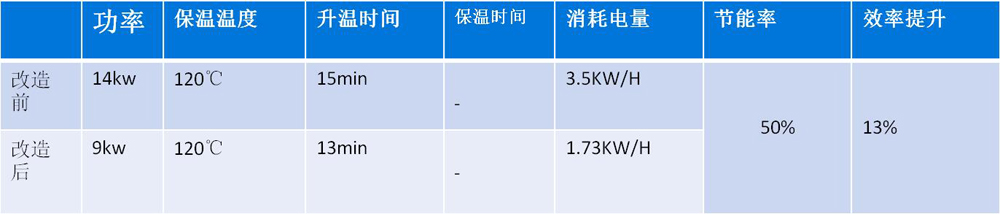 立式烤箱体积1.8m³,经过节能改造后,能耗从一炉耗电3.5w/h,下降到1.73kw/h,能耗降低50%;升温时间从原本的15min,改造后只需13min,效率提高13%。
